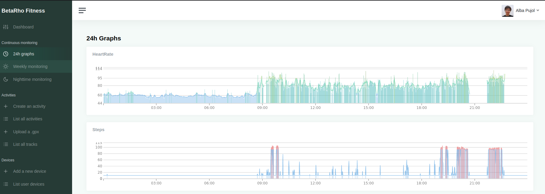This application allows to visualize this stored data and be a hub of all fitness-related data (detect day/night, sleep patterns, activities, GPX tracks from other devices…). All without having your data in a third party server outside of your control.